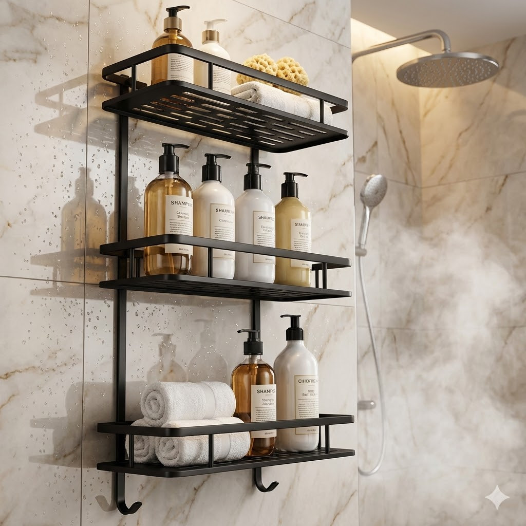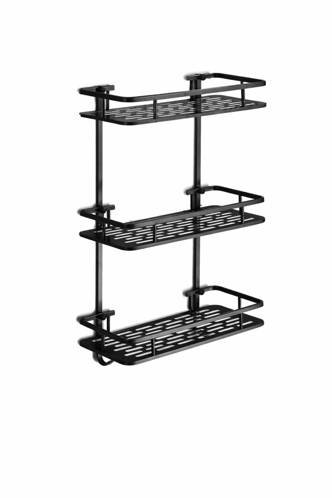 A modern, háromszintes fekete fürdőszobai polc ideális megoldás a samponok, tusfürdők, kozmetikumok és egyéb fürdőszobai kiegészítők rendezett tárolására. A négyzet alakú kialakítás elegáns megjelenést biztosít, miközben nagy tárolókapacitást kínál.
