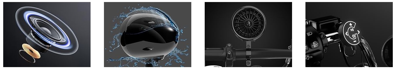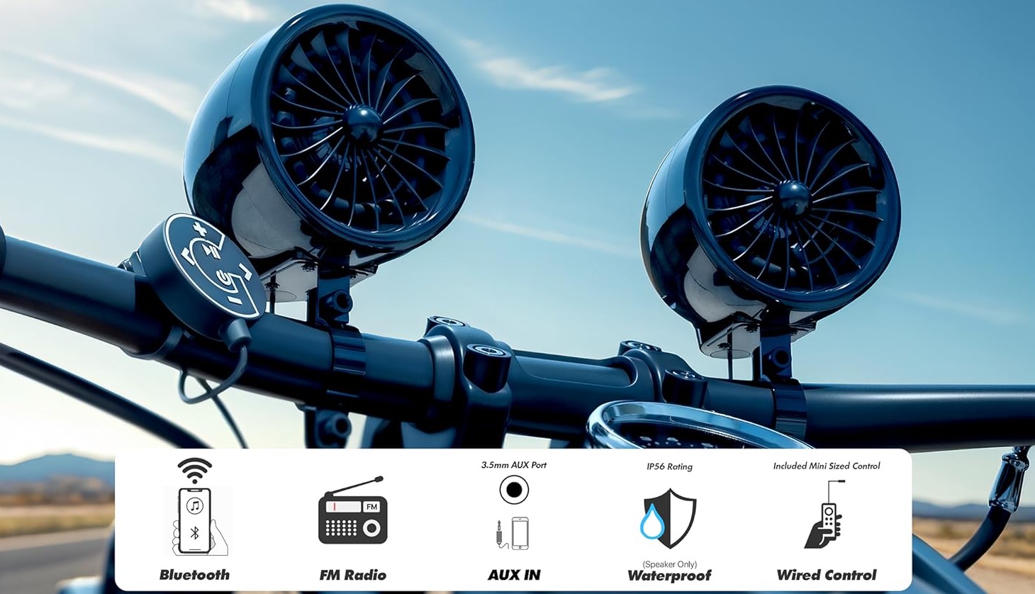 A kétcsatornás, 100 W teljesítményű erősítő két darab 4 hüvelykes, teljes hangzású sztereó hangszóróval motorkerékpárokhoz. Univerzális rögzítés 1,0–1,5 hüvelykes kormányhoz, így számos modellhez illeszkedik. Támogatja a vezeték nélküli Bluetooth kapcsolatot akár 15 méteres hatótávolságig, és innovatív, rejtett antennás kialakítással rendelkezik.