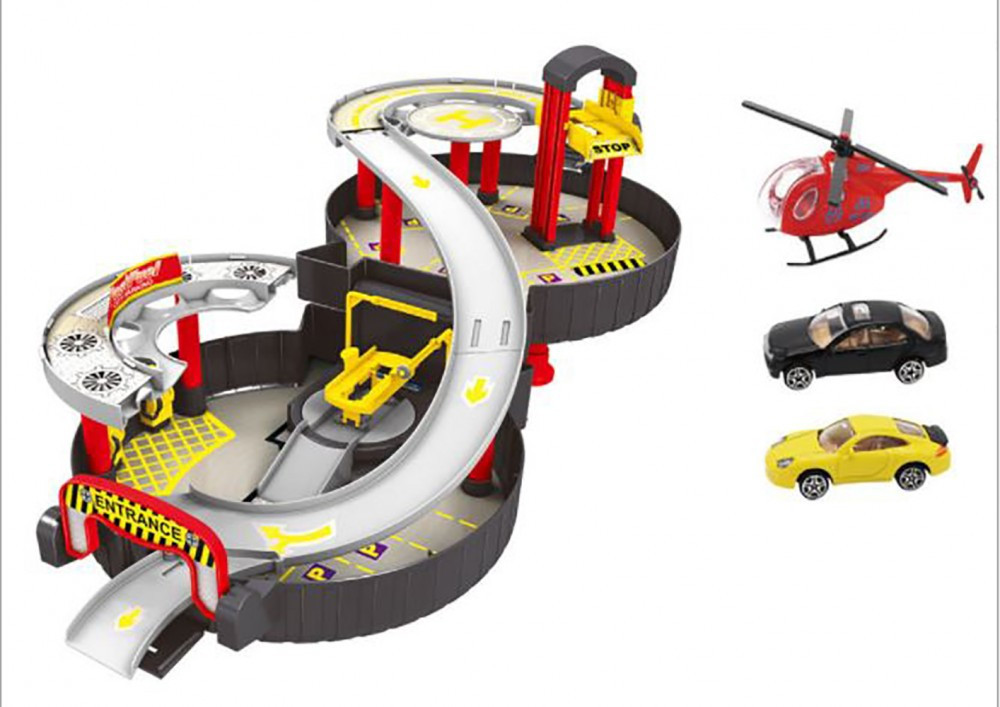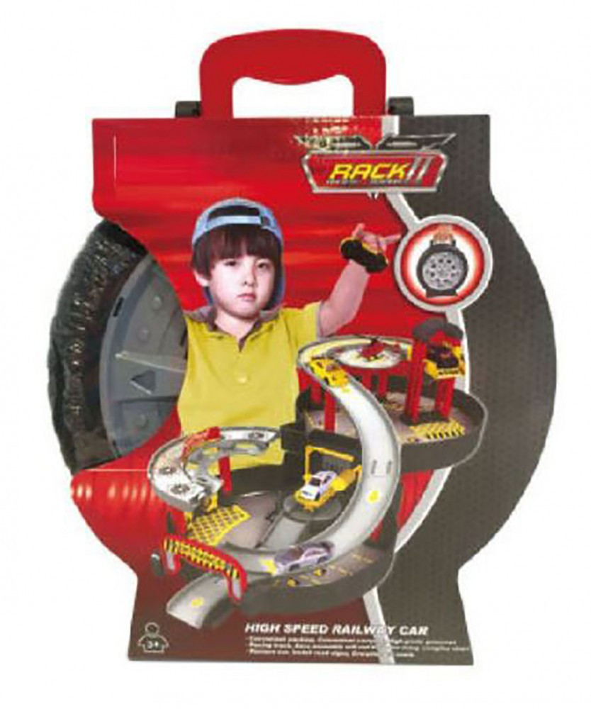 A dizájnos autókerék alakú tároló egy teljes parkolóházat rejt amit pár egyszerű lépésből össze is lehet szerelni a játékhoz. A végeredmény egy háromszintes pakolóház, útvonallal.