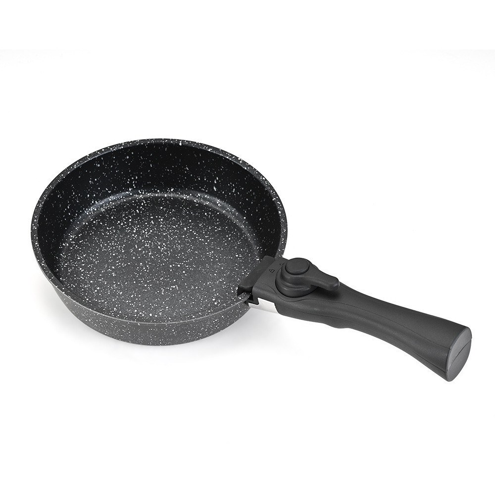 A levehető nyél egyetlen mozdulattal fel- és lecsatolható, így ugyanaz az edény főzés után tálalótálként is használható.