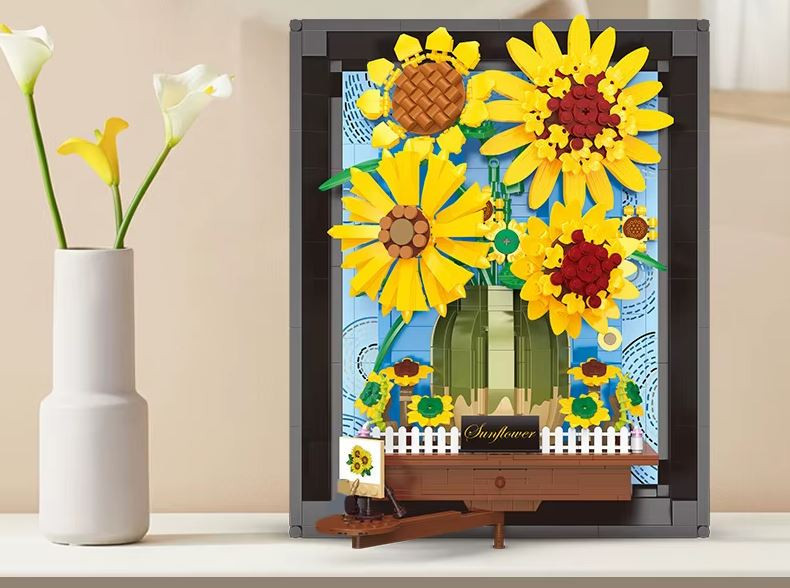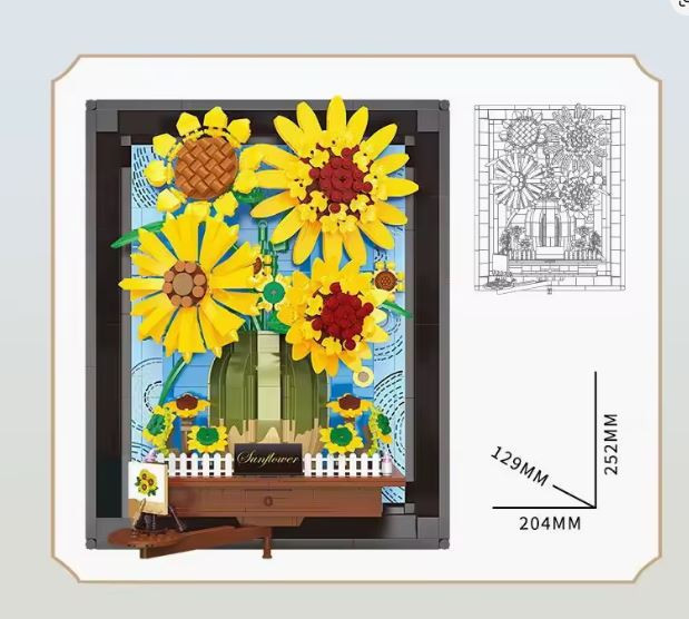 Ez a különleges építőkocka készlet Vincent van Gogh legendás Napraforgók festményének térbeli, 3D változatát mintázza, amely elkészítés után falra akasztható vagy polcra helyezhető díszként szolgál. Egyesíti a művészetet, a kreativitást és az építés élményét – tökéletes ajándék azoknak, akik szeretik az egyedi dekorációkat vagy az építőjátékokat.