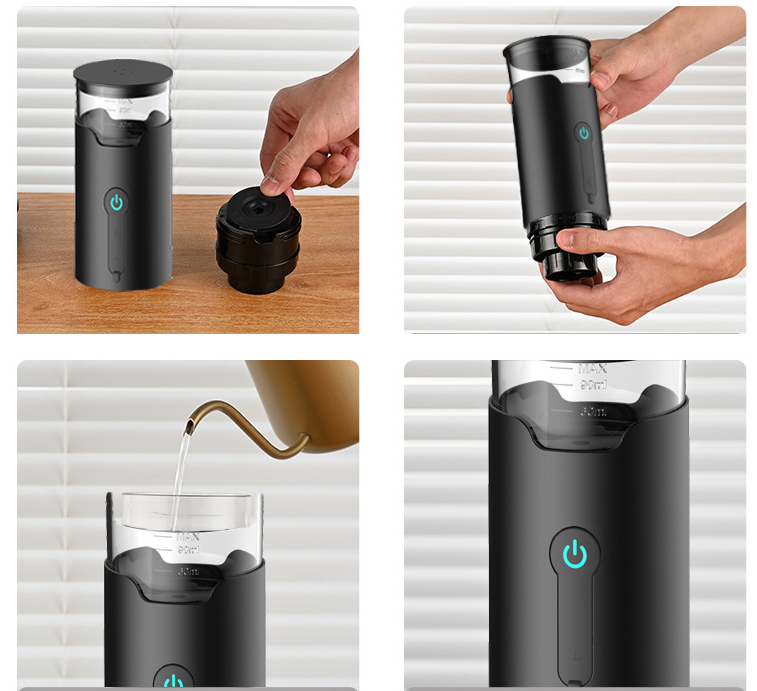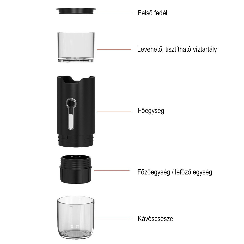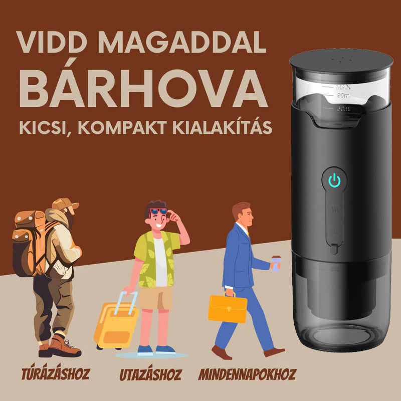 A mini méretű kávéfőző könnyen hordozható, egyszerűen elfér kézitáskában vagy hátizsákban. Ideális utazáshoz, irodába, kempingezéshez vagy autós használatra.