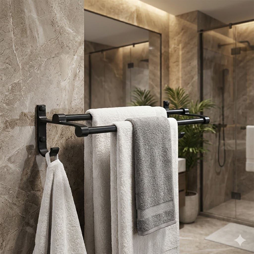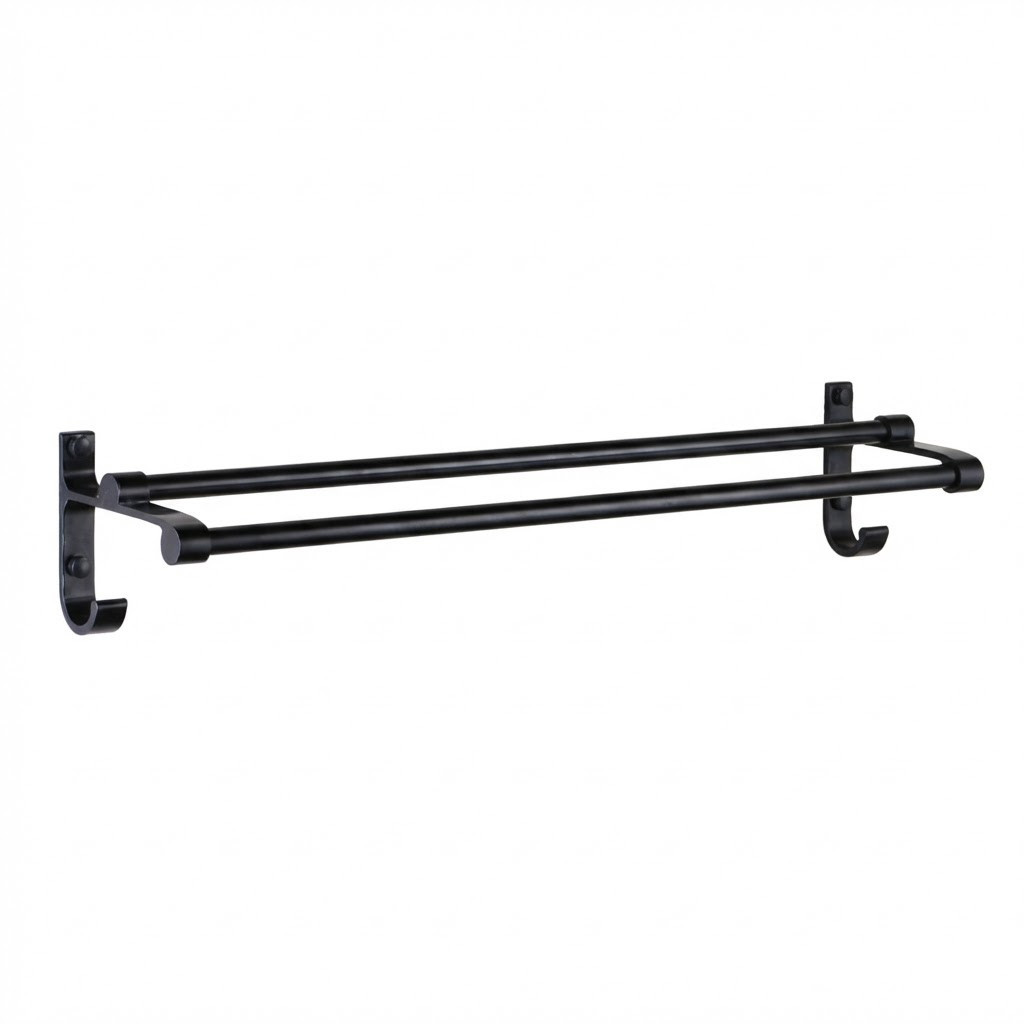 A modern, fekete dupla törölközőtartó praktikus és elegáns megoldás törölközők és fürdőlepedők rendszerezett tárolására. A két rúd kialakítás nagyobb szárítási felületet biztosít, így egyszerre több törölköző is kényelmesen elfér rajta.