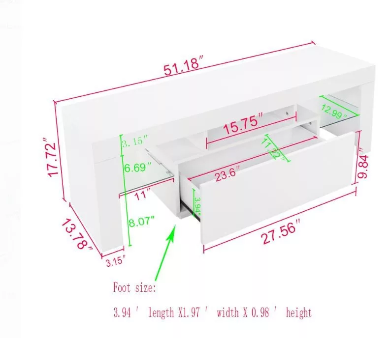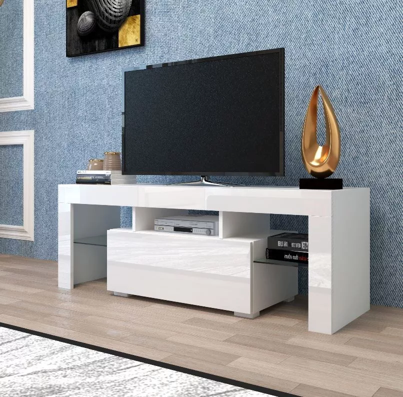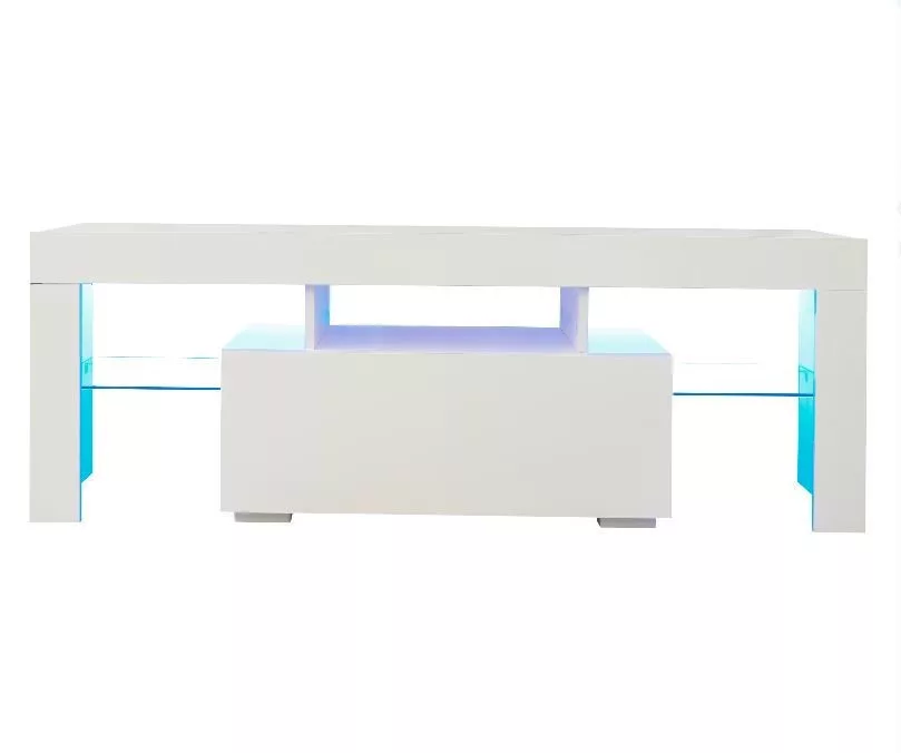 A szórakoztató központ TV-állványa 12 színű LED világító rendszerrel rendelkezik. Távolról vezérelheti a színeket, valamit ki és be is kapcsolhatja őket. Alkalmas akár 65 hüvelykes, azaz 160 cm képátlójú TV-khez. Pompázhat a nappali vagy a hálószoba díszeként.