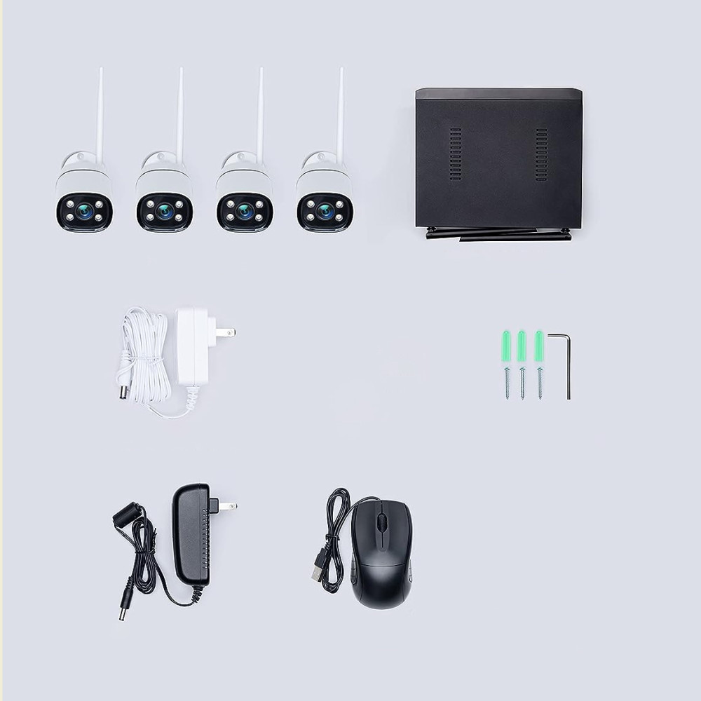 4 darab 2 MP biztonsági kamerát, 1 darab NVR készüléket, 1 darab 12V2A tápegységet, 4 darab 12V1A tápegységet, 1 darab optikai egeret, 4 darab öntapadó tappancsot, 1 darab felhasználói útmutatót.